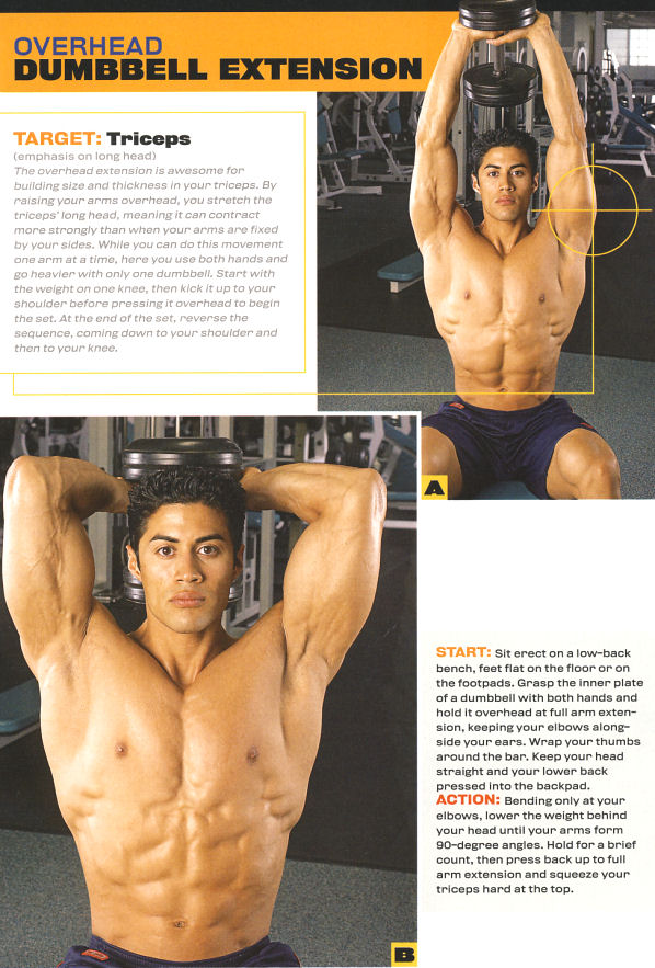 目标肌肉:肱三头肌 作为另外一个练习肱三头肌的复合动作,与肩同宽握距的卧推能够比常规的标准卧推施加给肱三头肌的作用更大。千万注意训练过程中两手不要握距过窄,避免杠铃的重量过度施加于你的手腕而没有把额外的负重用于刺激肱三头肌。训练的关键在于,训练的过程中保持两肘适度收紧而不要让两肘向外过分扩展。史密斯机的优点在于,它拥有一个限定的运动轨迹,所以,当你调整训练动作的时候发现某个杠铃杆平面对于你的肱三头肌刺激最大,你就可以在整个训练组坚持那样的训练轨迹。 起始状态:以仰卧的姿态躺在置于史密斯机内部的平板长凳上,双脚自然平放在地板上。以窄握的方式(大约为肩宽)的方式正手握住杠铃杆。旋转一下史密斯机杠铃杆并微微向上推是的杠铃杆脱离挂靠在机械上的状态,并且充分伸直你的手臂将杠铃杆推至你胸部上方。 训练过程:逐渐放下杠铃杆,让杠铃杆下降至你胸部的下缘,同时保持你的两手肘尽量靠近身体。不要做出让杠铃完全贴胸并反弹的动作;而是要在杠铃杆接近胸部大约1英寸或者大致的距离的时候,短暂停顿,然后将杠铃推回到起始状态。在杠铃推至顶端的时候充分压榨你的肱三头肌和胸肌。 颈后哑铃臂屈伸 目标肌肉:肱三头肌 (侧重肱三头肌长头) 颈后哑铃臂屈伸是增大你肱三头肌的围度和厚度的很猛的方法。你把手臂举至头顶上方时,你已经充分拉伸了肱三头肌的长头,这就意味着你在训练的过程中能够更加强烈地收缩肱三头肌,这个动作比其他两手尽量固定于靠近身体两侧的方法更加凑效。当然这个动作你可以只用单臂锻炼,不过本文认为你也可采用双手持有一个哑铃进行训练并采用更大的重量。你首先应该把一个沉重的哑铃搁置在你的膝盖上(采用坐姿),然后用膝盖将它向上顶起借助惯性把哑铃推至肩上,最后再把哑铃(用双手)推举至头顶上方,开始训练组。在一组训练结束,把刚才的动作逆序进行即可,把哑铃放到你的肩上,再放到膝盖上。 起始状态:以背部竖直的姿势坐在低背靠凳上,双脚平放在地面上,或者放在护足的踏板上。贴近哑铃内侧的盘片用双手抓握住哑铃,并将哑铃举过头顶让双臂完全伸展,让你的两肘尽量靠近你的双耳。用你的大拇指环绕着哑铃中间的连杆。保持你的头部竖直,还有你的下背部仅靠背部的靠板。 训练过程:只需要弯曲你的手肘即可,在颈后放下哑铃,直到你的手肘达到90度夹角。保持这个姿势数秒,然后再把哑铃举回到手臂完全伸展的状态,并在达到顶端的时候,充分压榨收缩你的肱三头肌。 哑铃臂屈伸